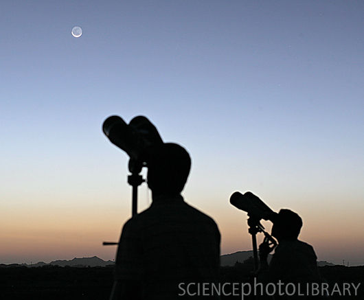 Observing the crescent Moon by binoculars.